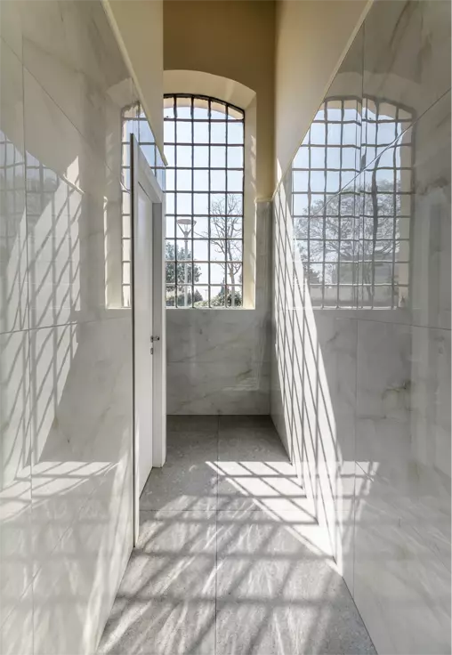 the tiles, imported from italy, laser cut with the finest precision, are made of light veined marble, inlaid with arches cut from fine italian terazzo.